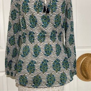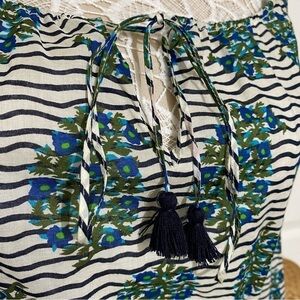 Tory Burch Top white Green Flora Cotton Scoop Neck Keyhole Tunic Elastic waist 6