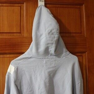 This authentic Tory Burch Tory Sport hoodie is a stylish, athleisure essential featuring an intentionally oversized, relaxed fit. It showcases a soft pale blue color with a contrasting huge double V logo design across the front in crisp white. Crafted in a classic pullover hooded sweatshirt style, it is made from 100% breathable cotton for ultimate comfort. The generous cut is perfect for a cozy fit, effortless layering, or achieving that trendy, slouchy aesthetic for casual weekend wear.