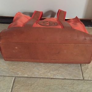 Orange tote perfect for going to the beach. It is in decent condition although there are some scuff marks on the bottom as well as some small stains on the inside.