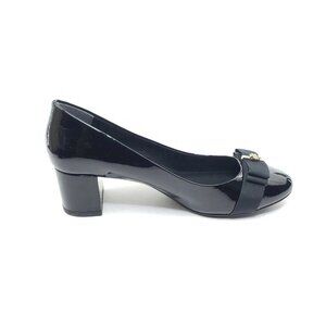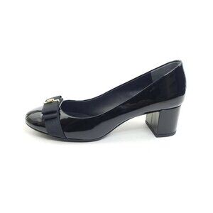 Tory Burch Trudy Black Patent Block Heel Pumps Logo Bow Womens Size US 8M