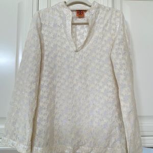 Sheer fabric with embroidered stars, slight bell sleeve. Perfect for July 4th holiday celebration!