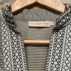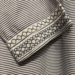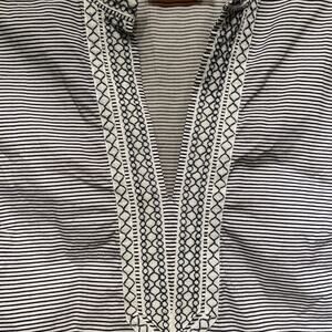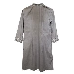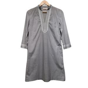 Timelessly chic, this authentic Tory Burch striped tunic dress blends tailored simplicity with beautiful embroidered trim details. Featuring ¾ sleeves, a band collar, and a notched neckline, this piece is perfect for coastal getaways, resort wear, or classic summer style.