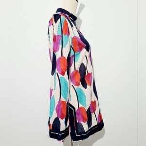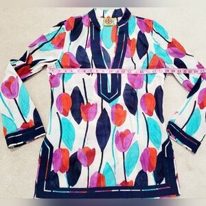 Stylish and vibrant Tory Burch tunic top featuring a bold multicolor tulip floral print. This 100% cotton blouse offers a lightweight and breathable feel, perfect for warm-weather wear or resort vacations. The top has a split neckline with navy trim, long sleeves, and a relaxed fit for effortless chic styling. Size 6