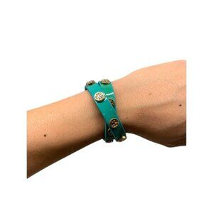 Tory Burch Turquoise Double Wrap 6.5" Enamel Gold Studded Leather Bracelet USA