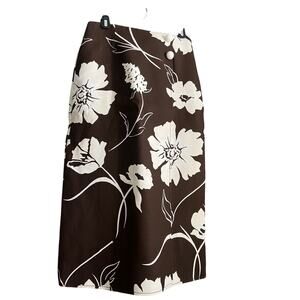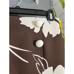Amazing printed twill crepe wrap skirt with large "mod" buttons at the waist. Substantially heavy, it's an absolutely on-trend fall piece with chocolate brown floral print; perfect to pair with boots or a cute heel.