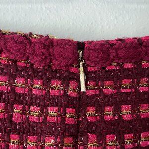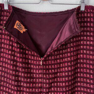 Dark Plum multi. Zipper in back. Above knee/knee length depending on your height.