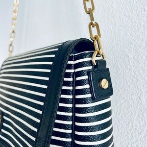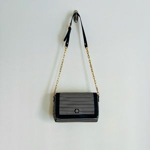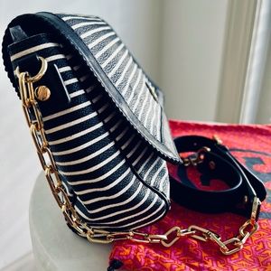 Tory Burch Viva Striped Crossbody Bag - very rare vintage style! Black and white stripe bag with black buckled leather and chain shoulder/crossbody strap; 18" drop. Leather trim with pinked edges and gold hardware. Double-T logo adorns flap top; hidden snap closure. Black canvas interior lining with one zip pocket and two open pockets.