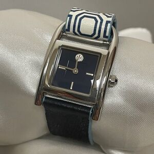 Tory Burch's inspired Thayer timepiece features a navy and white leather strap sporting a print from interior designer David Hicks. Style #TBW7503