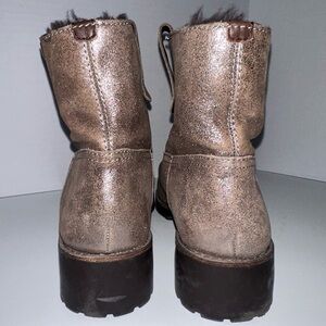 Metallic Tory Burch booties in cozy shearling. Pull-tabs at top line. Rubber heel and lug sole. Brown interior. Pewter Metallic leather