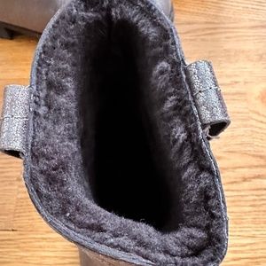 Tory Burch Wayland Short Boot in "Pewter-Espresso." These are such great boots! They're older and super hard to find. I only wore them about 2 or 3 times, so despite the age they're in great shape!! There are no signs of wear or tear. So Comfortable & So Warm!! The leather is metallic--it isn't quite "pebbled" but it isn't smooth either. The boots are SUPER warm lined with dyed Lamb Fur. Round toe. Stacked heel. Treaded sole. Pull on with pull tabs to make it nice & easy. Size 8.
