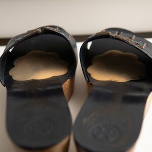 Tory Burch Wedge Black Leather Wood Platform Sandals LOGO Size 9 Slip On Heels