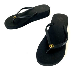 Tory Burch Wedge Flip Flop Sandal Black Thong Toe Gold Logo Slip On Platform 7.5