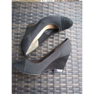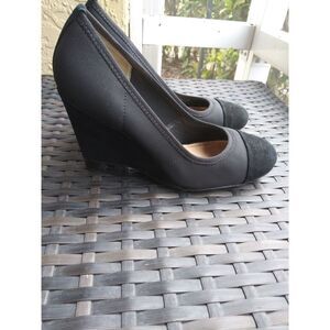 Tory Burch wedge heels size 5 and 1/2 in good pre-owned condition normal wear and tear the color is black Bin 0