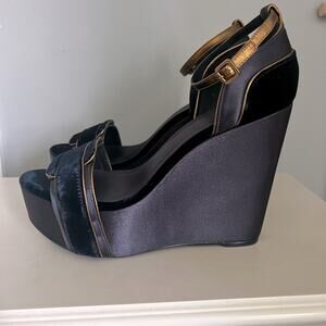 Size 10 / wedge height 5” / platform 2” / ankle strap buckle closure / light wear / excellent preowned condition/ retail 495