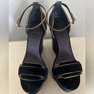 Tory Burch Wedge Sandal the Alexia Navy Blue/Gold Velvet Satin Heels Size 10