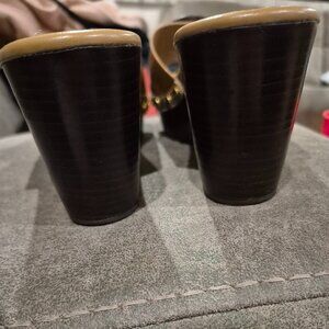 Beautiful Wedge Tory Burch slides - basically new. Not work outside - the little size sticker is still attached. Oddly there is a small pink stain on the interior but the exterior are in great shape, no nicks or scuffs. Basically almost perfecT