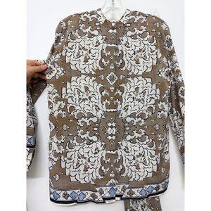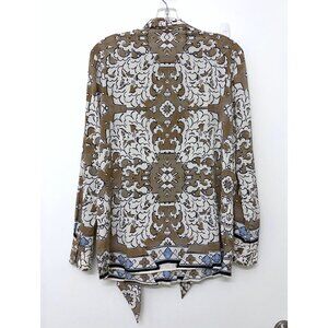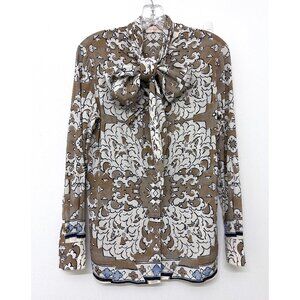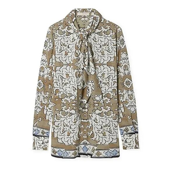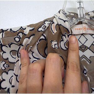 Tory Burch Wheat Nocturne Print Silk Blouse Top Floral Taupe White Bow Tie 4