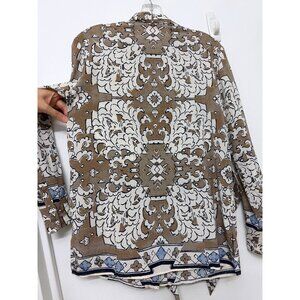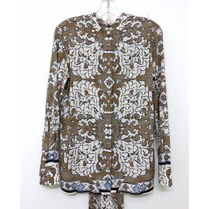 This Tory Burch Wheat Nocturne Print Silk Shirt is in great condition! This blouse features a white floral print on a taupe / tan background. Silk, bow tie neck, long sleeves, button down shirt style. There is a mark on the neck tie. Minor wear throughout. There is some wrinkling on the sleeve cuffs.