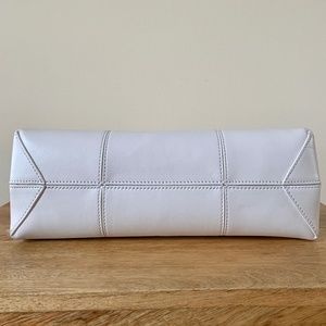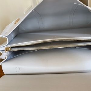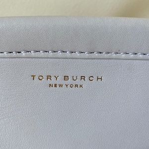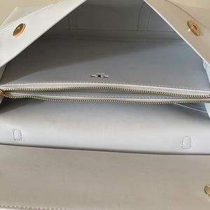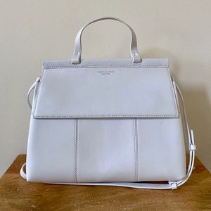 Tory Burch white T Leather Satchel Bag with gold-tone hardware. New with dust bag. Bag features flat handles with single adjustable shoulder strap, leather lining and single interior pocket. snap closure at front.