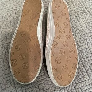 Elegant Tory Burch flats. White with silver logo detail. Perfect for casual wear.