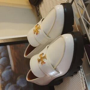 Stylish white loafers with a signature gold emblem. Ideal for a polished look.