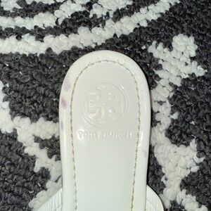 Stylish Tory Burch Miller sandals with iconic logo design. Perfect for casual outings. White.