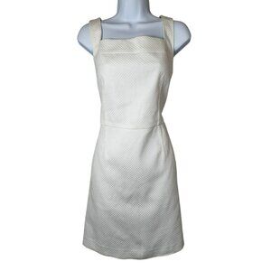 This stunning Tory Burch sleeveless sheath dress is in crisp white. Crafted with a textured woven finish, this classic square-neck design offers a flattering silhouette perfect for business events, weddings, or elegant gatherings. Fully lined for comfort, it features a hidden back zipper and tailored fit.