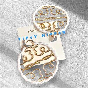 Tory Burch White and Gold Logo Hoop Earrings (6cm)