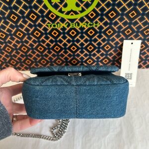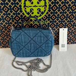 Tags: designer, preppy, neutral, denim, blue, 2000s, Y2K, mini bag, small bag, top handle bag, crossbody bag, cruise, trip, travel, vacation, Tory Burch bag, Tory Burch crossbody, Tory Burch purse, Tory Burch top handle bag, Tory Burch sale