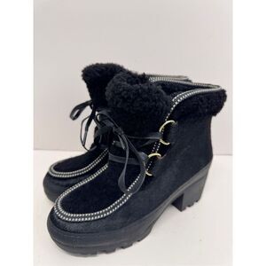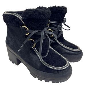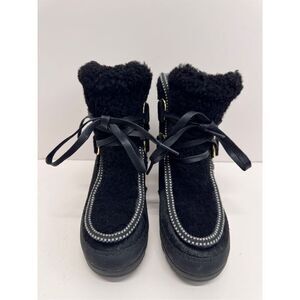 Tory Burch Winter Boots Size 6 Black Shearling Berkley Bootie Block Heel Lace Up