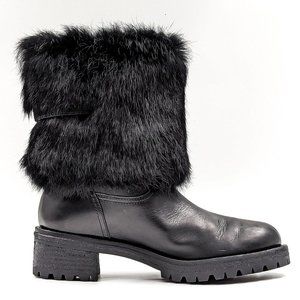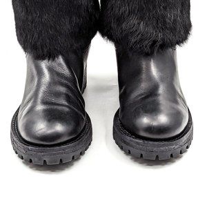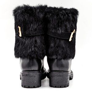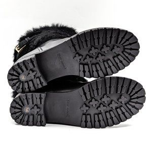Tory Burch Women Joni Fur Cuff Buckle Logo Black Leather Mid Calf Boots size 7