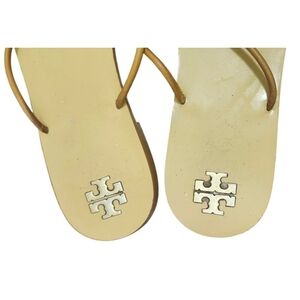 Tory Burch flip flops, gold logo sandals, tan leather thong sandals, Tory Burch 10M, designer flat sandals, summer beach sandals, resort vacation shoes, classic Tory Burch style, trending Tory sandals, minimalist leather sandals.