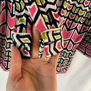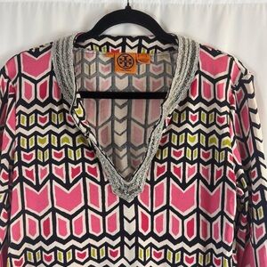 Chic Tory Burch tunic with a bold geometric design. Features pink, black, and yellow hues. Stylish V-neck and long sleeves.