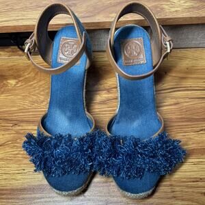 Tory Burch Women's 8 Shaw Blue Denim Royal Tan Espadrille Wedge Sandals N3874