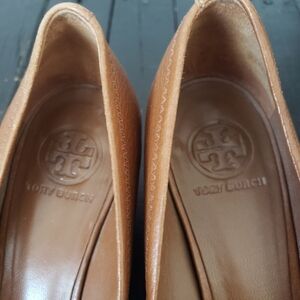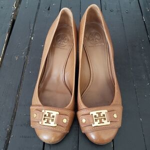 Tory Burch Women's 8 Tan Leather Wedge Heel Flats Shoes Gold Hardware Designer