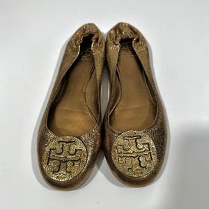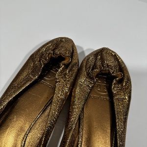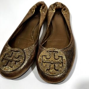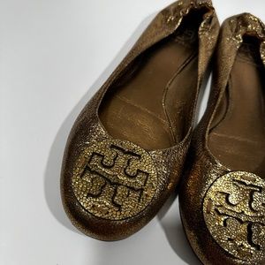 Tory Burch [ Womens 9.5 ] Metallic Crackle Leather Shine Slip on Flats in Bronze