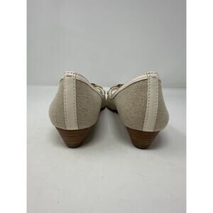 They are crafted with a burlap fabric and leather upper, a leather lining, and a rubber sole.
