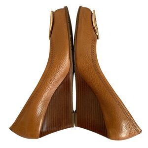 Tory Burch Women’s Brown Leather Logo Peep Toe Wedge Pumps Shoes US 7