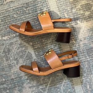 Tory Burch Women's Eleanor Block Heel Leather Sandals Size 9 Brandy Cognac Brown