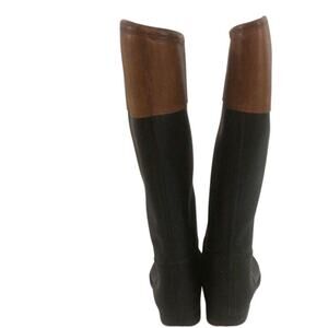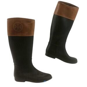 Tory Burch riding boots, equestrian style boots, black and brown boots, rain boots, waterproof riding boots, knee-high boots, rubber boots, Tory Burch logo boots, tall rain boots, fall fashion boots, winter boots, preppy boots, stylish rain boots, classic riding boots, size 8 boots, designer equestrian boots