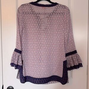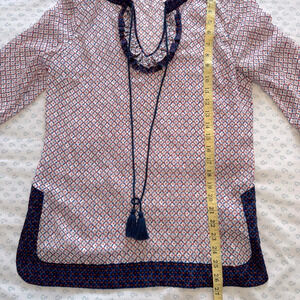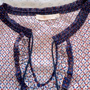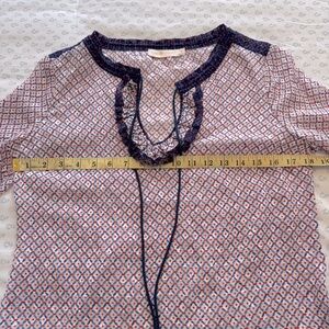 Elegant women's Tory Burch blouse featuring a stylish pattern with navy and red accents. Perfect for any occasion. Semi sheer material with navy tassel tie front.