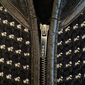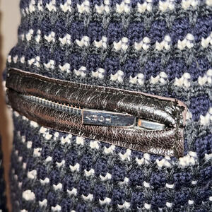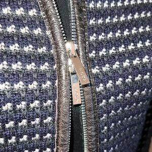 Tory Burch Women’s Houndstooth Blue, Gray, and White, with Brown Leather Trim Car Coat Sweater Jumper with duel full zip closure, 2 zip pockets. Size: XS in good pre-owned condition, reflected in the price. No holes or stains, but a few unnoticeable pulls. ****Styled on a size 4 mannequin****Size tag is missing****