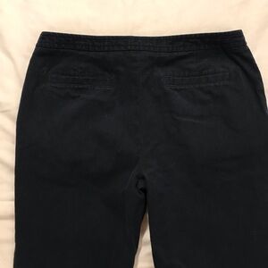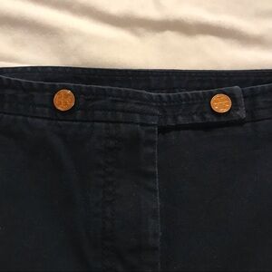 Tory Burch women’s sailor pants in low rise with cropped /regular length. Beautiful deep navy blue color accented with goldtone Reva Miller T-cross buttons on the waistband. Stretch cotton with side pockets and back slash pockets. Dry clean for best results and color.