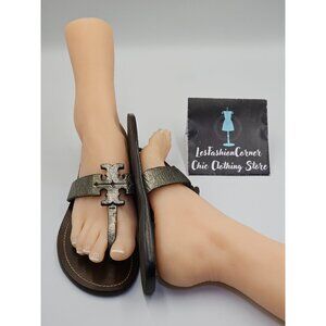 Tory Burch Women's Metallic Gunmetal Leather Moore T-Strap Sandals Sz 7.5 2644