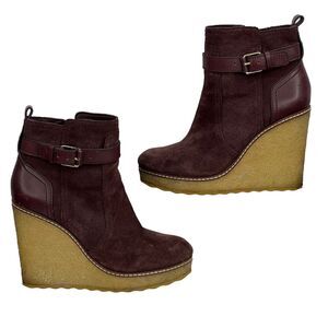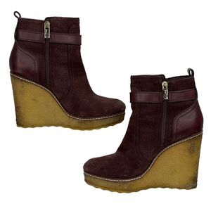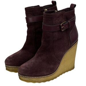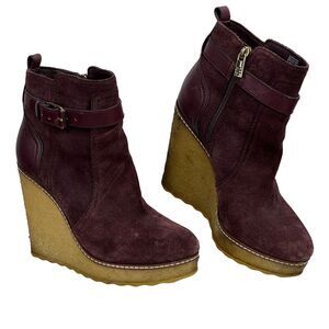 Elevate your shoe game w/ these stunning Tory Burch Remy ankle boots. The beautiful shiraz purple suede upper, almond toe shape & ultra-high wedge heel make these boots perfect for workwear, casual outings, or even travel. The shearling lining provides warmth & comfort in the colder seasons of fall, winter & spring.