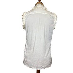 This Tory Burch sleeveless blouse features charming ruffle details and a button-down front, adding elegance and style to your outfit.