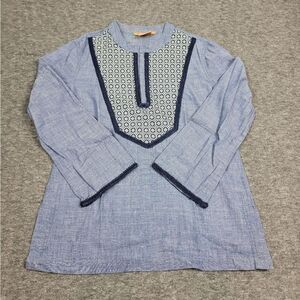 Tory Burch Womens Size 6 Blue Chambray Embroidered Popover Tunic Top Blouse