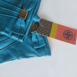 Tory Burch Women's Teal Green Leather Bow Pleated Gloves Size 6.5
