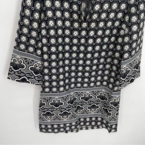 Tory Burch Womens tunic dress Silk floral Geometric pattern Size 4 Black Gray white. Side zip. V neck. 3/4 sleeves. Bust 36. Length 35. Measurements are approximate. No collar. Very good preowned condition.