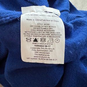 This cobalt blue merino wool cardigan features gold Tory Burch buttons, slits on the side and two front pockets. It measures 18" pit to pit and 25" from the shoulder to the hem. It is in excellent practically new condition.